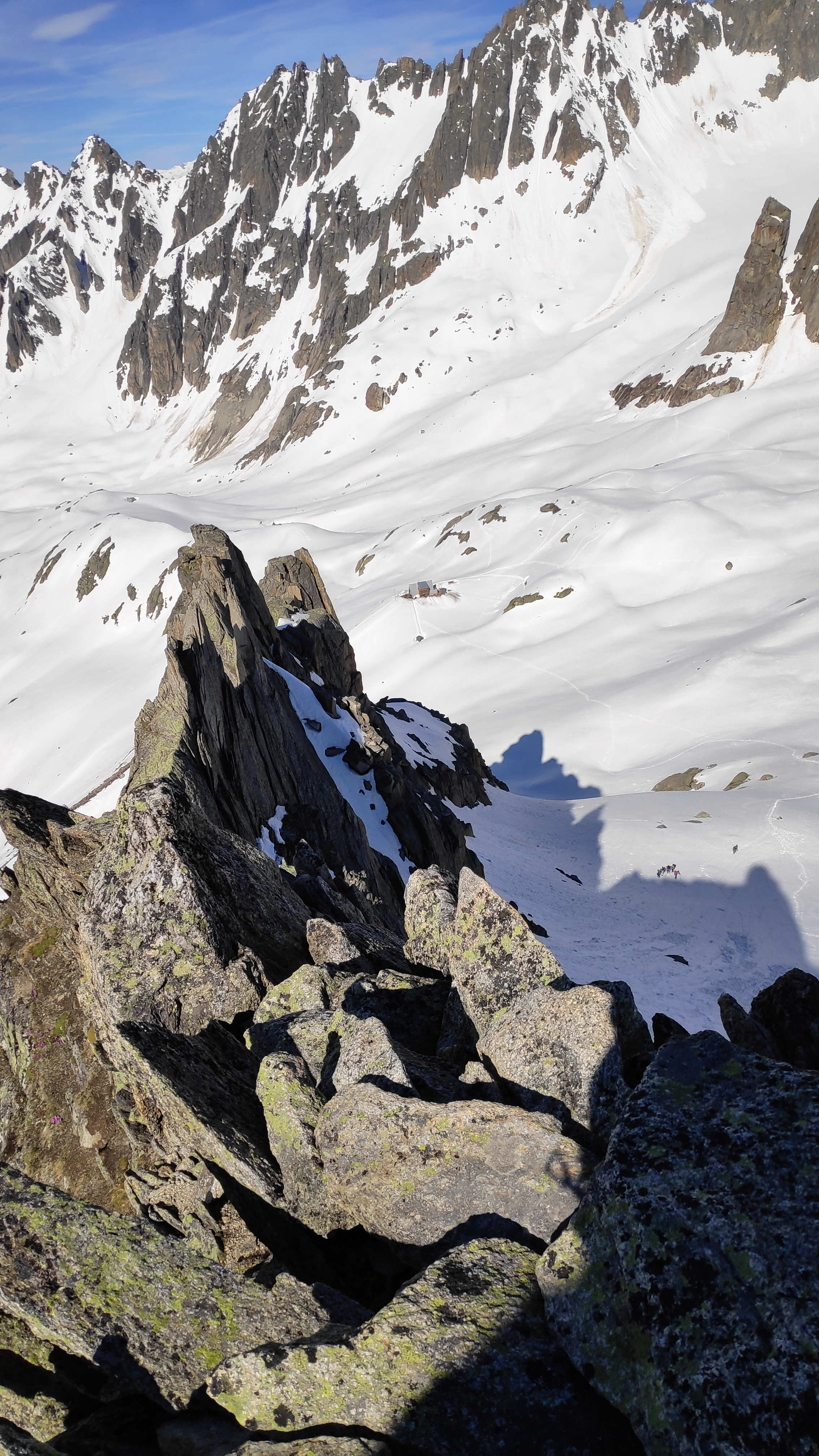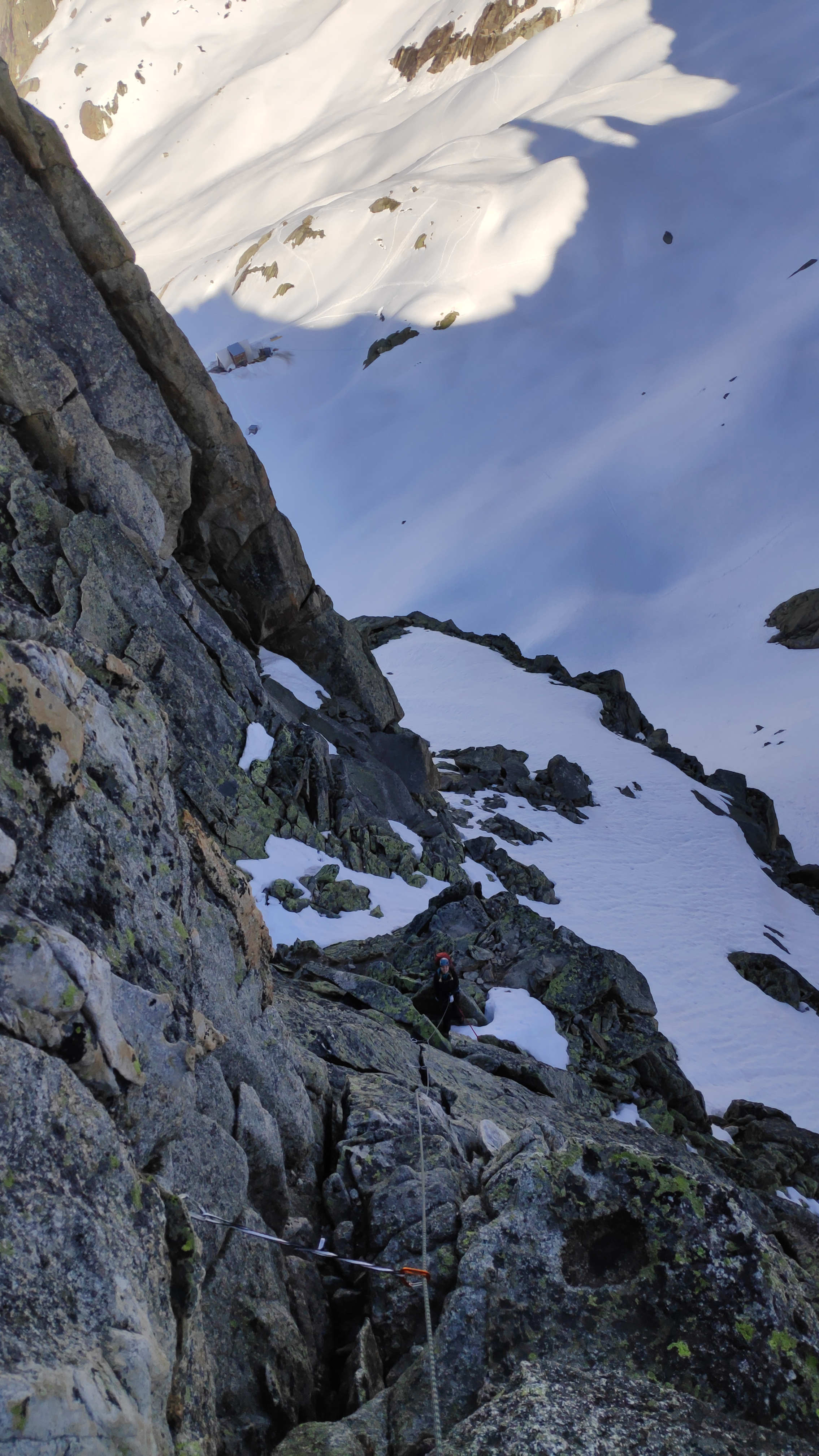 Von der Hütte ists nicht weit zum Einstieg. Und eben dieser war noch so voll mit Schnee, dass die erste Seillänge gar nicht geklettert werden konnte. Wir wählten einen Einstieg weit rechts von der normal Route, um direkt auf das erste Plateau zu gelangen. Schliesslich wollten wir nicht extra die Steigeisen montieren, für die 10m.