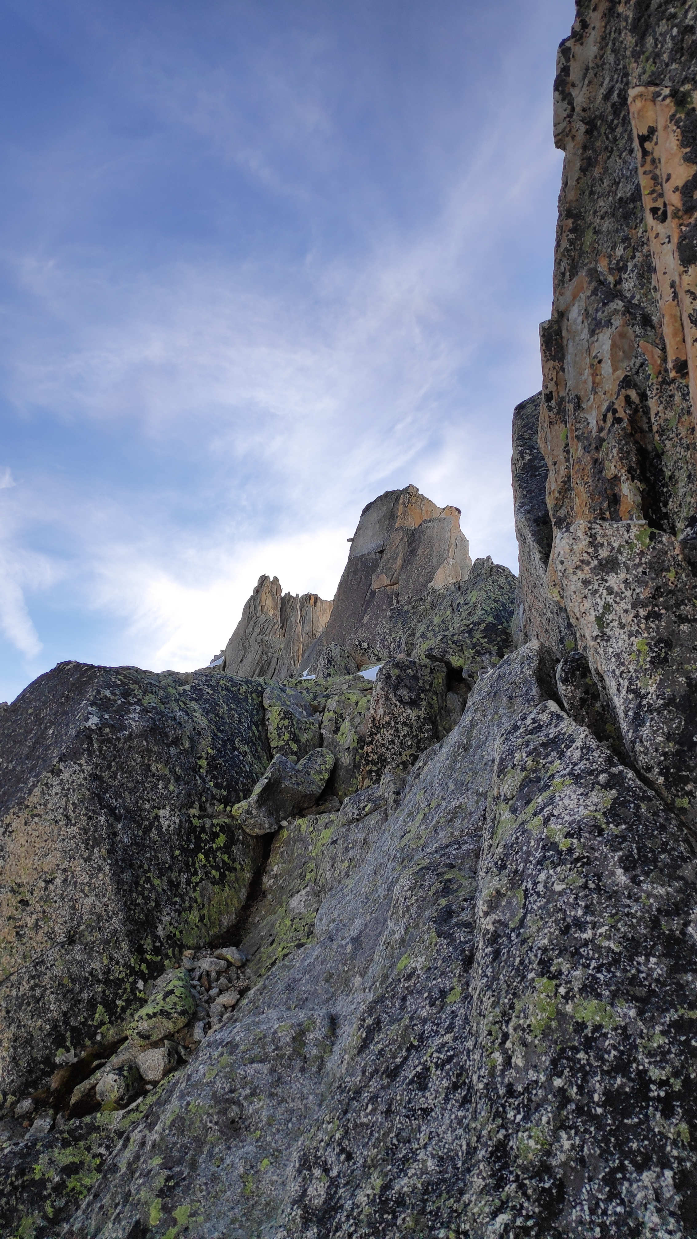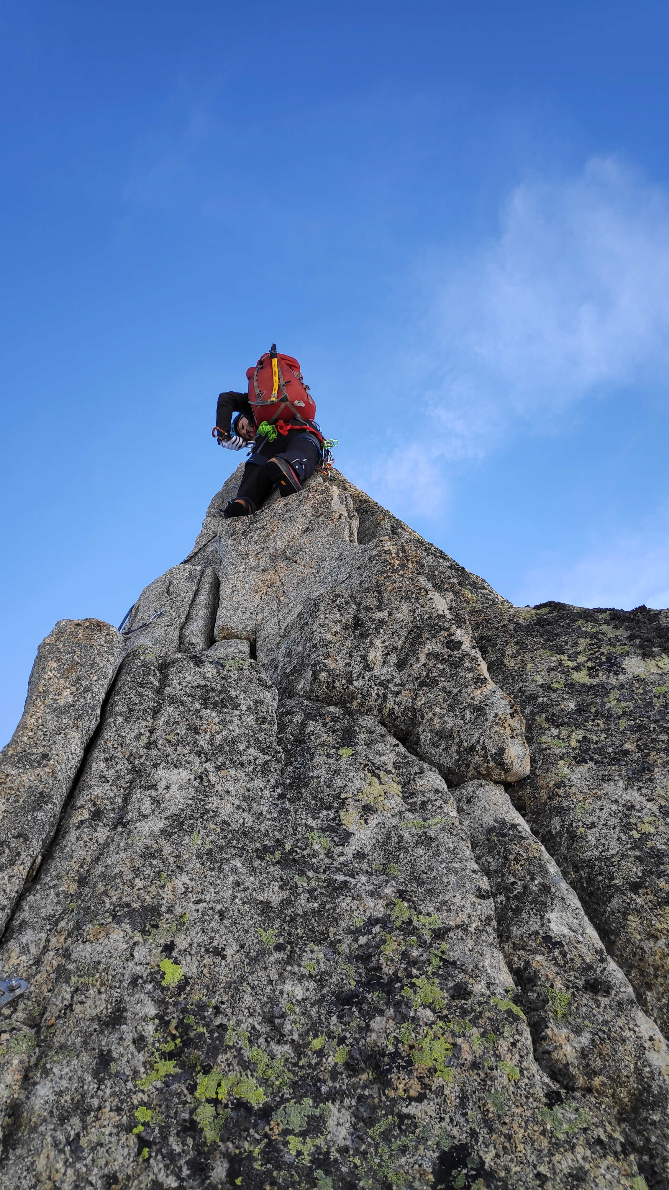 Am obersten Teil des Zackens steht man sehr sehr ausgesetzt auf kleinen Vorsprüngen. Da der Zacken fertig ist, muss man sich irgendwie da hochdrücken aber links gehts grad runter und rechts noch einiges weiter genauso senkrecht. Caro zögerte einige Male den Zug zu machen bis Zack geschafft und sie stand oben.