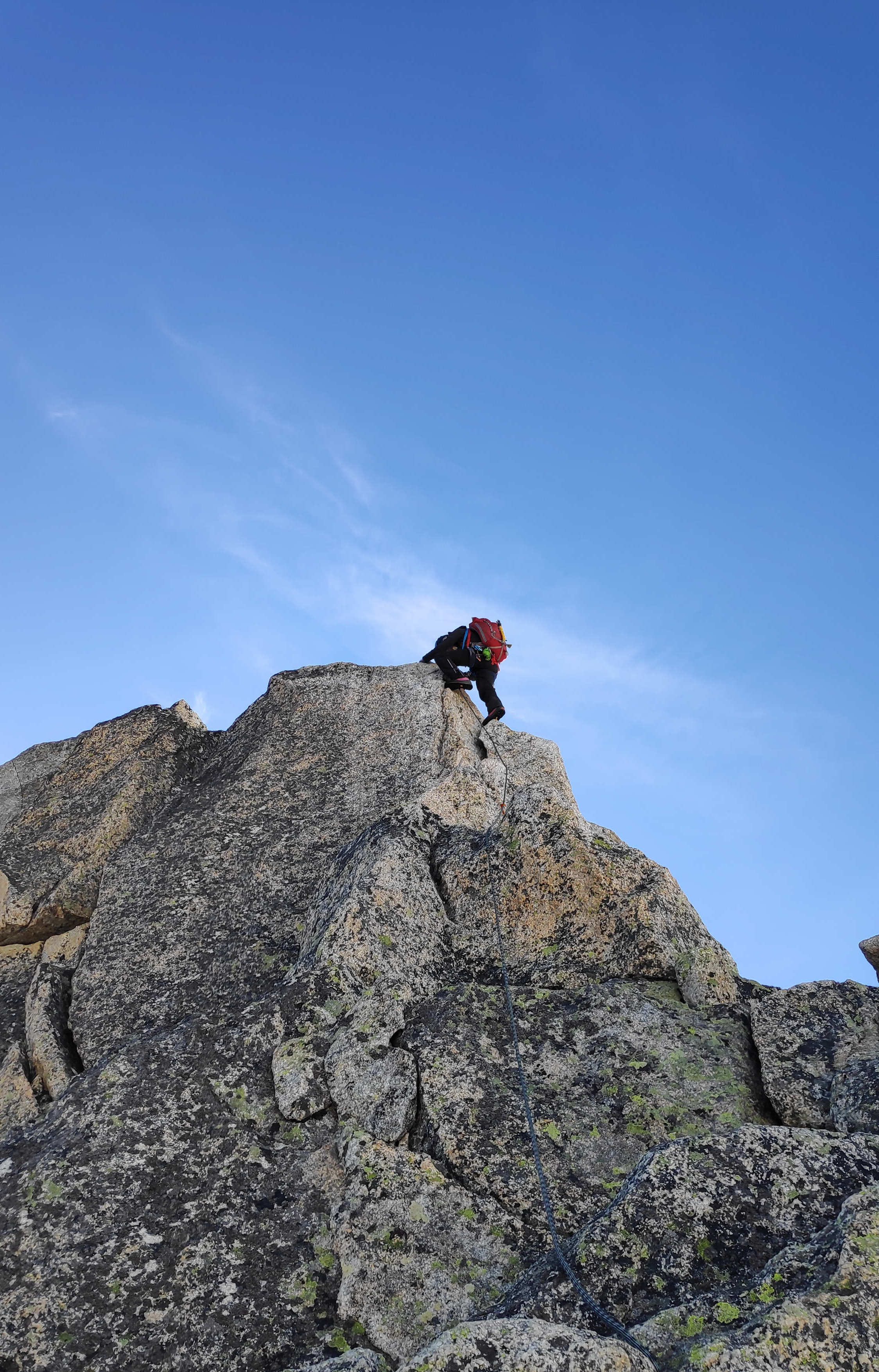 Noch ein zwei hübsche Klettereien folgten, gemischt mit kurzen Gehabschnitten und da wars auch schon geschafft. Zumindest fast, der Gipfel noch 10m über uns und der Schnee selbst für mich Hüfttief. Selten bin ich so abgesoffen, trotzdem liess ich es mir nicht nehmen und würgte mich noch irgendwie auf den Gipfel hoch.