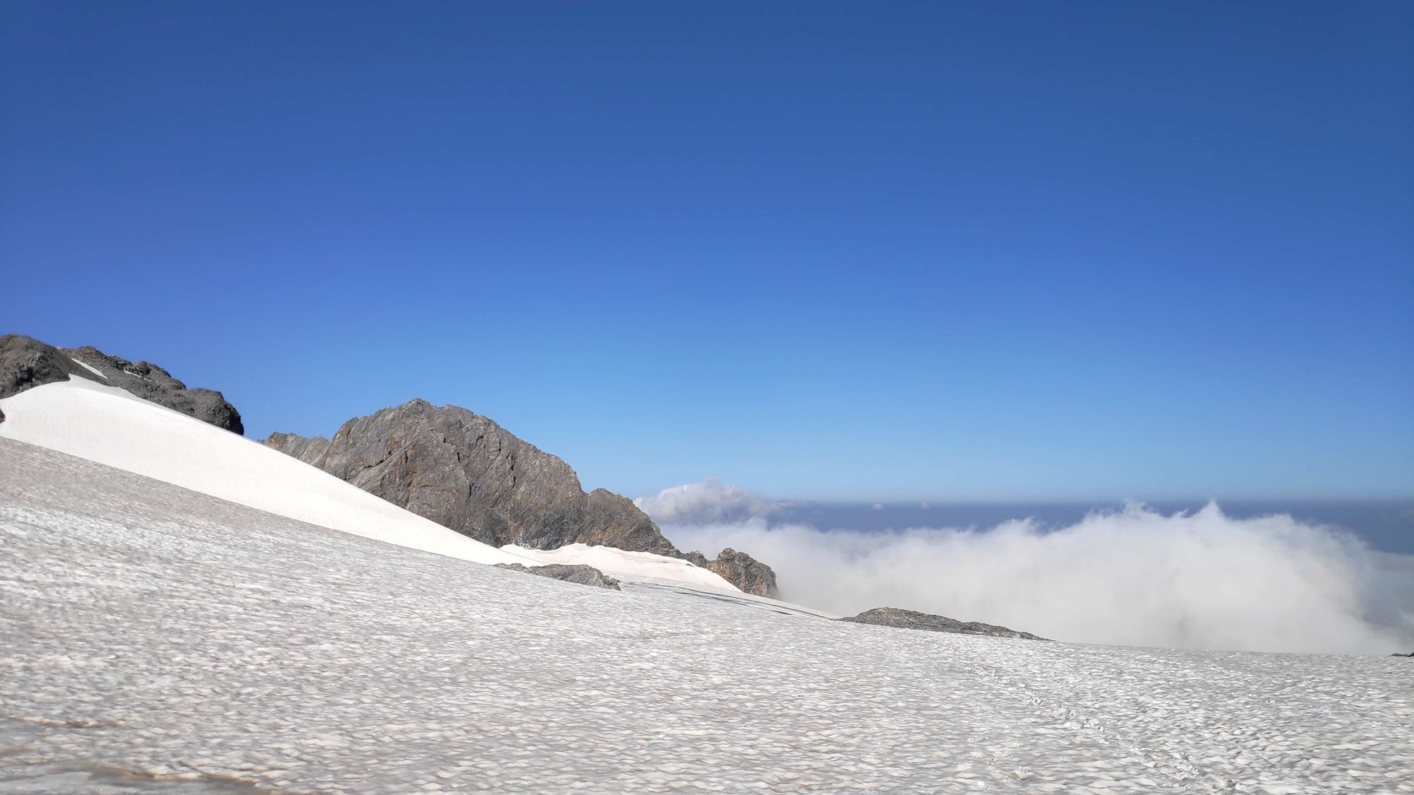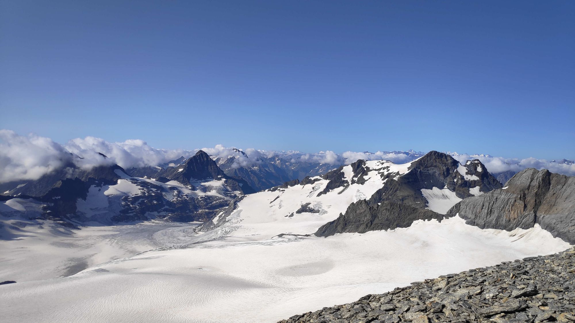 Um halb sieben starteten wir, vor uns schon ganze Horden an Berggängern, nicht die einzigen mit der Idee. Wir trafen wieder mal das komplette Sortiment an lustigen Spasten an. Kurze Hosen mit Gamaschen war schon ein wenig das Highlight. Aber es gab auch glanzmomente der Seiltechnik auf dem Gletscher "oh, ab hier hats wieder Spalten, gehen wir mit Abstand". Wir hielten uns schön auf Abstand zu all denen.