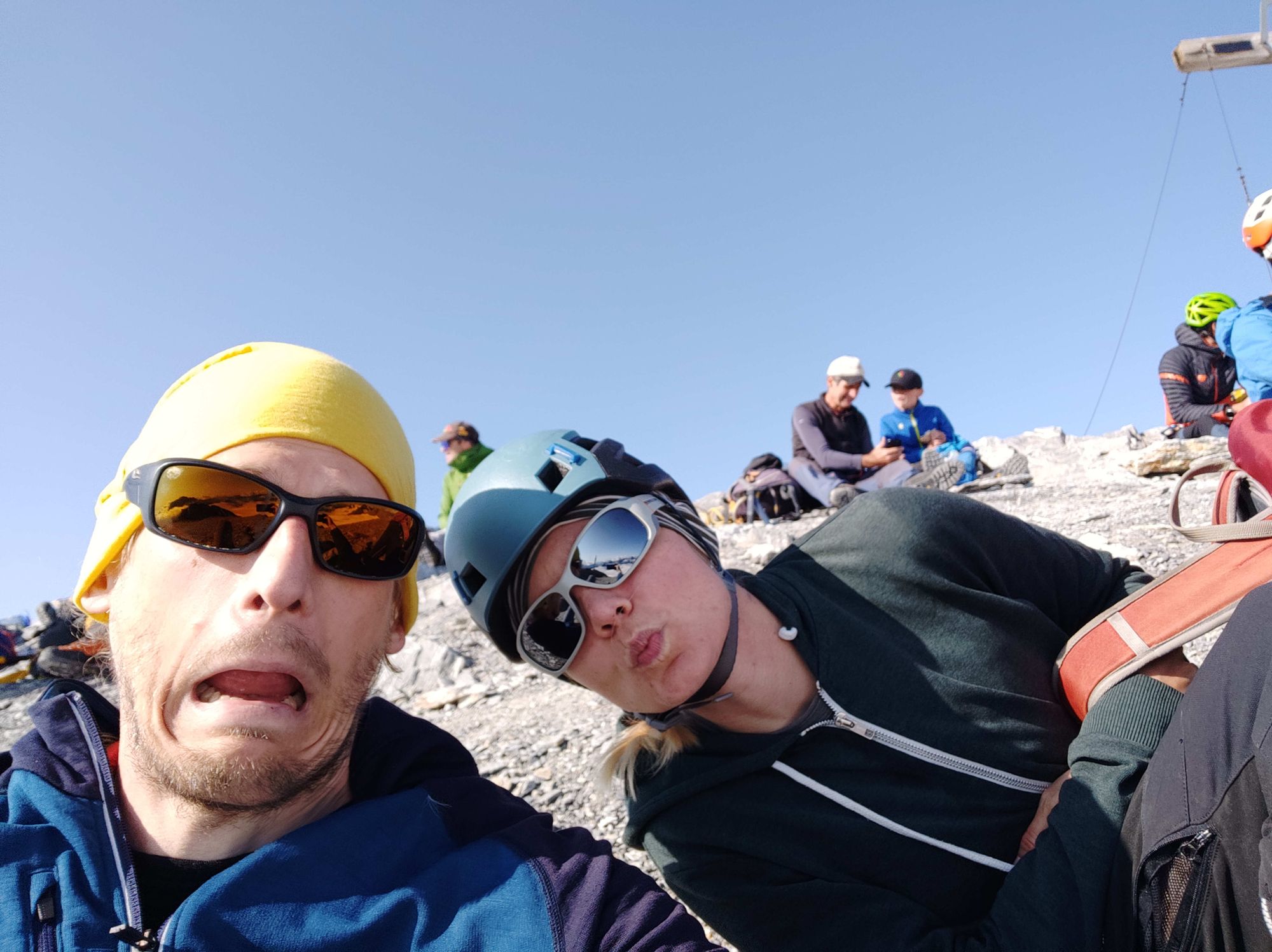 Kurz vor dem Vorgipfel konnten wir auch noch die zwei vor uns ein- und überholen, was uns erlaubte ohne Steinschlag Gefahr den brüchigen Schlussanstieg anzugehen. Das war wichtig, den ich Spasst hatte den Helm im Auto vergessen. Nach knapp 3.15h standen wir auf dem Gipfel, und kehrten eigentlich sogleich um. Denn Auf dem Gipfel sassen ca. 20 Leute und es windete.