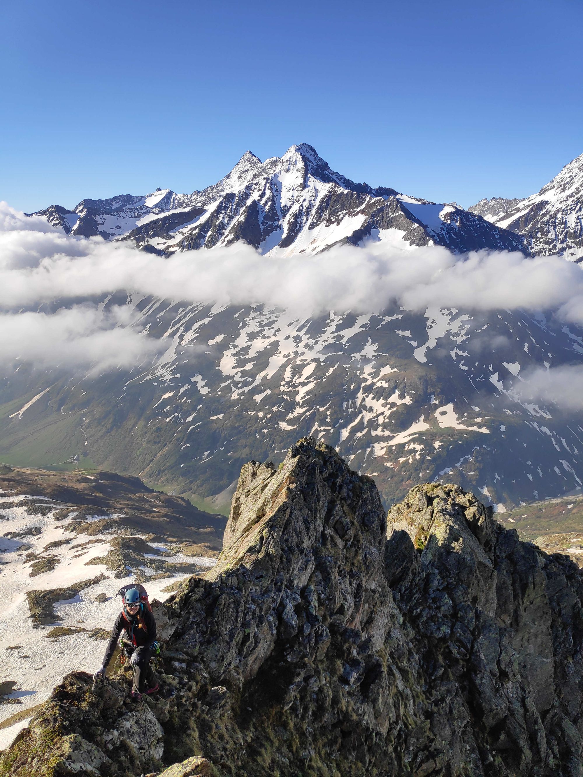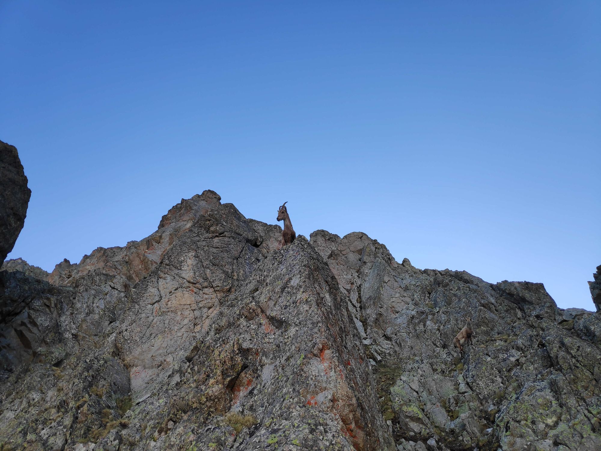 Kurz vor dem Einstieg, begrüssten uns zwei junge Steinböcke mit lautem pfeifen. Sie fragten sich wohl, was die zwei Pappnasen hier um diese Jahreszeit machen. Leider mussten wir immer genau in ihre Richtung aufsteigen, sodass wir sie vor uns her-scheuchen mussten. Auf dem Grat angekommen, nahmen wir uns extra viel Zeit, damit die zwei Jungspunde Zeit hatten, sich von uns zu entfernen.