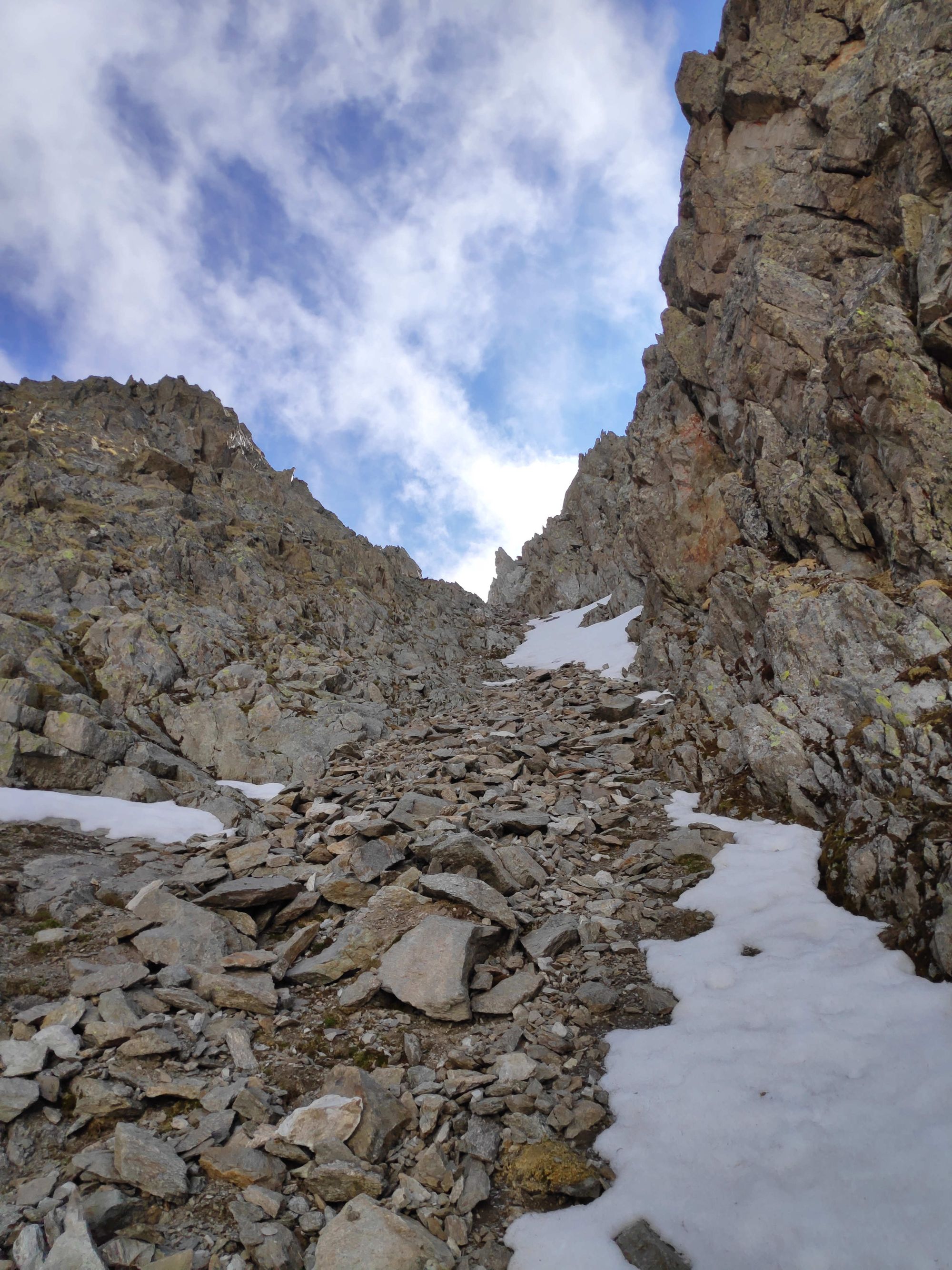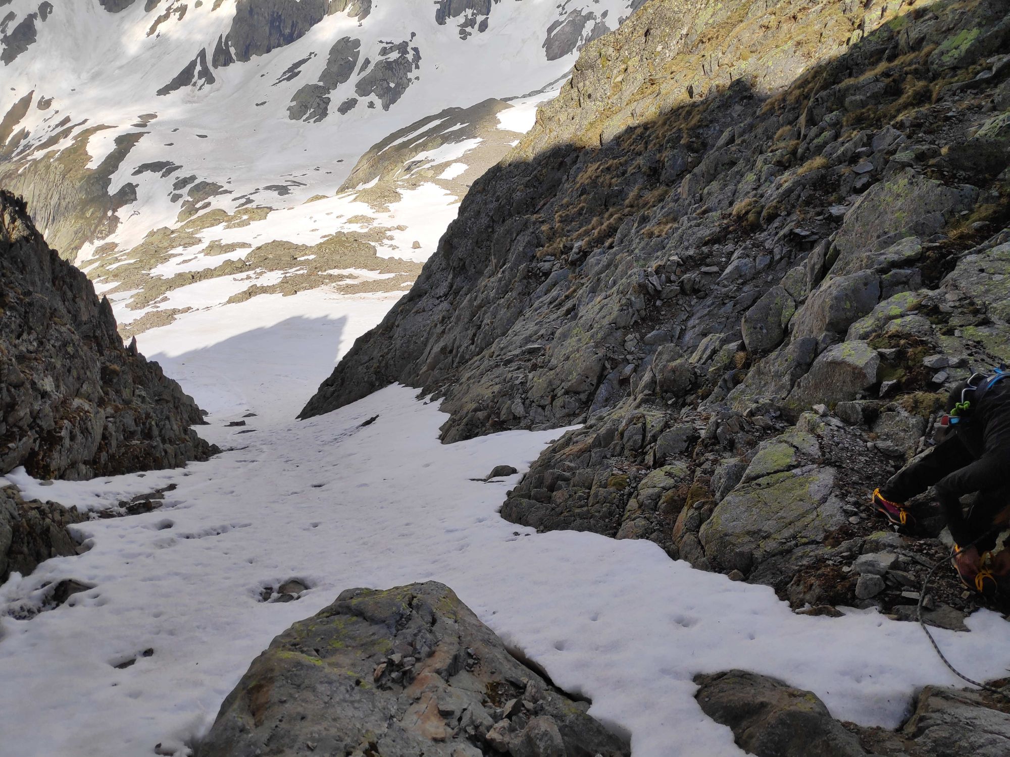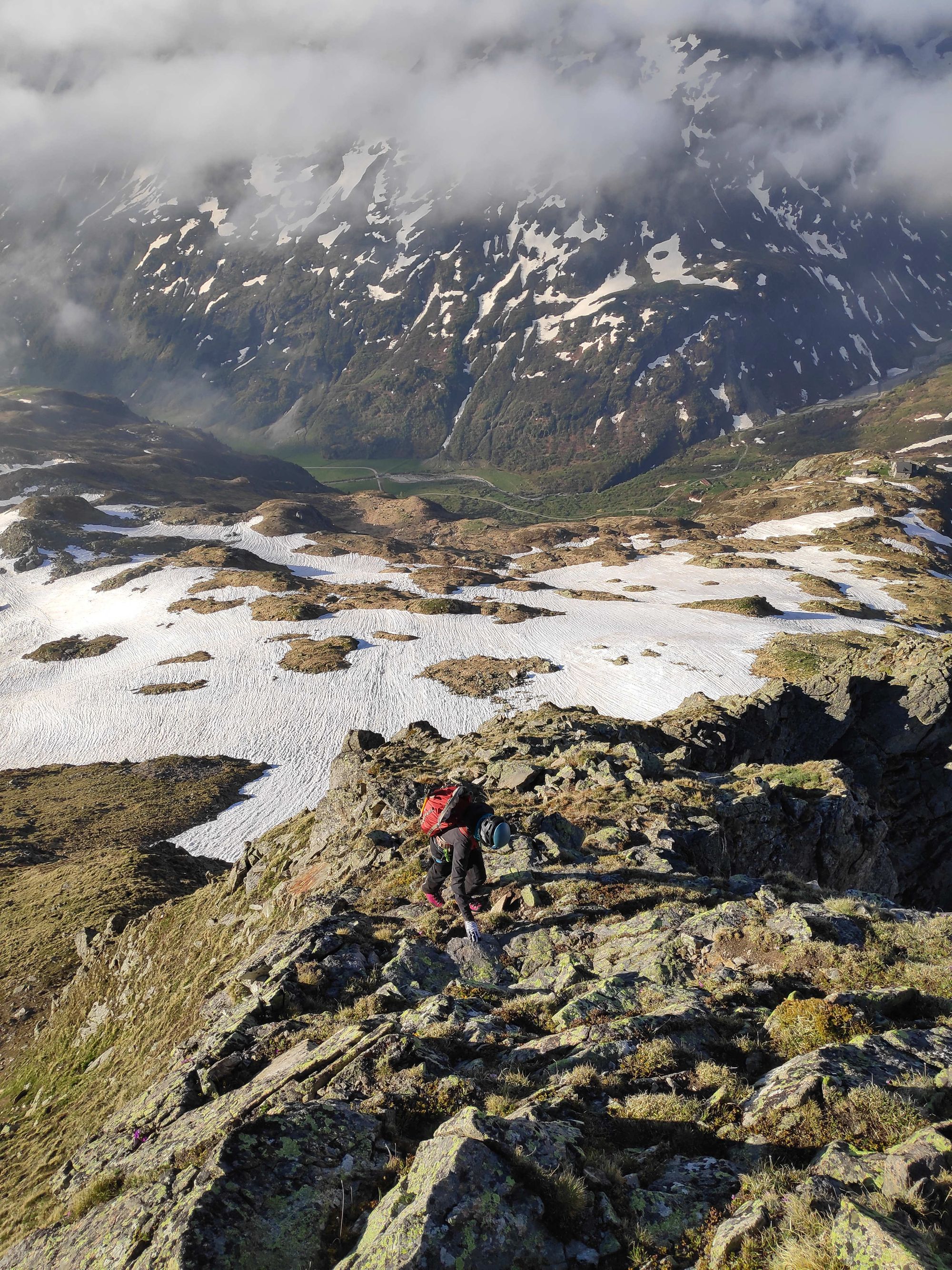 Der Abstieg, soll gemäss SAC Tourenportal, den Nordgrat runter führen. Wir schauten das von oben an und entschieden uns dagegen. Wir waren von Beginn an sicher, dass wir entweder alles zurück klettern, oder durch Couloir auf halben Weg absteigen werden. Später meinte auch der Hüttenwart, dass die Abstiegs Beschreibung schwachsinnig sei und er das dem SAC noch melden müsse. Er würde da nicht mal rauf klettern wollen, so schlecht sei der Fels.