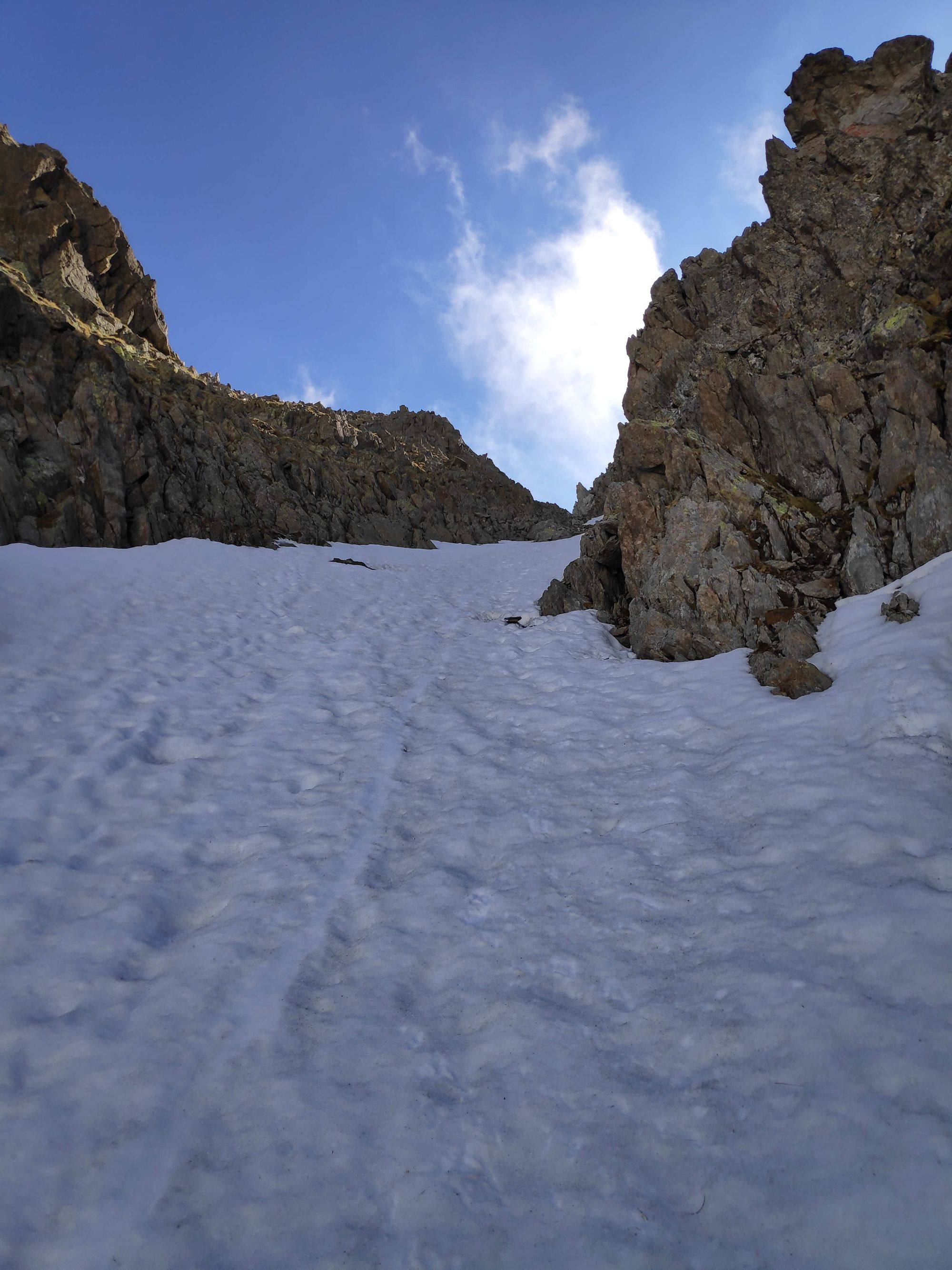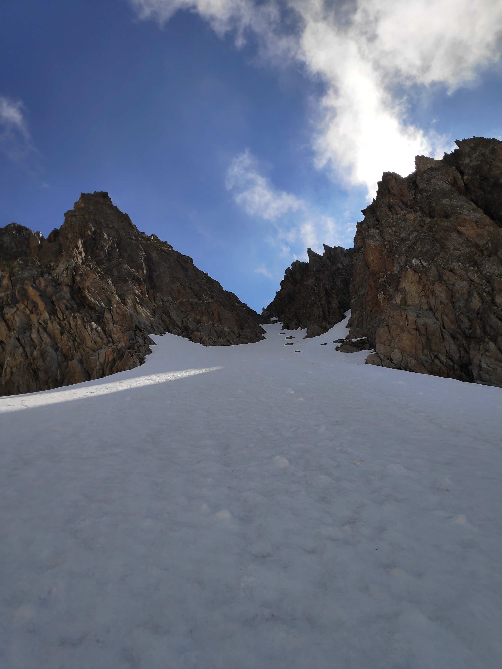 Wir stiegen in der Gipfelflanke in einfachem Gehgelände zurück bis zum Couloir, welches wir beim Aufstieg sahen. Der Beginn ist ziemlich brüchig und schuttig, der zweite Teil dann in relativ steilem Schnee. Wir besprachen uns kurz und entschieden, dass wir das machen können.