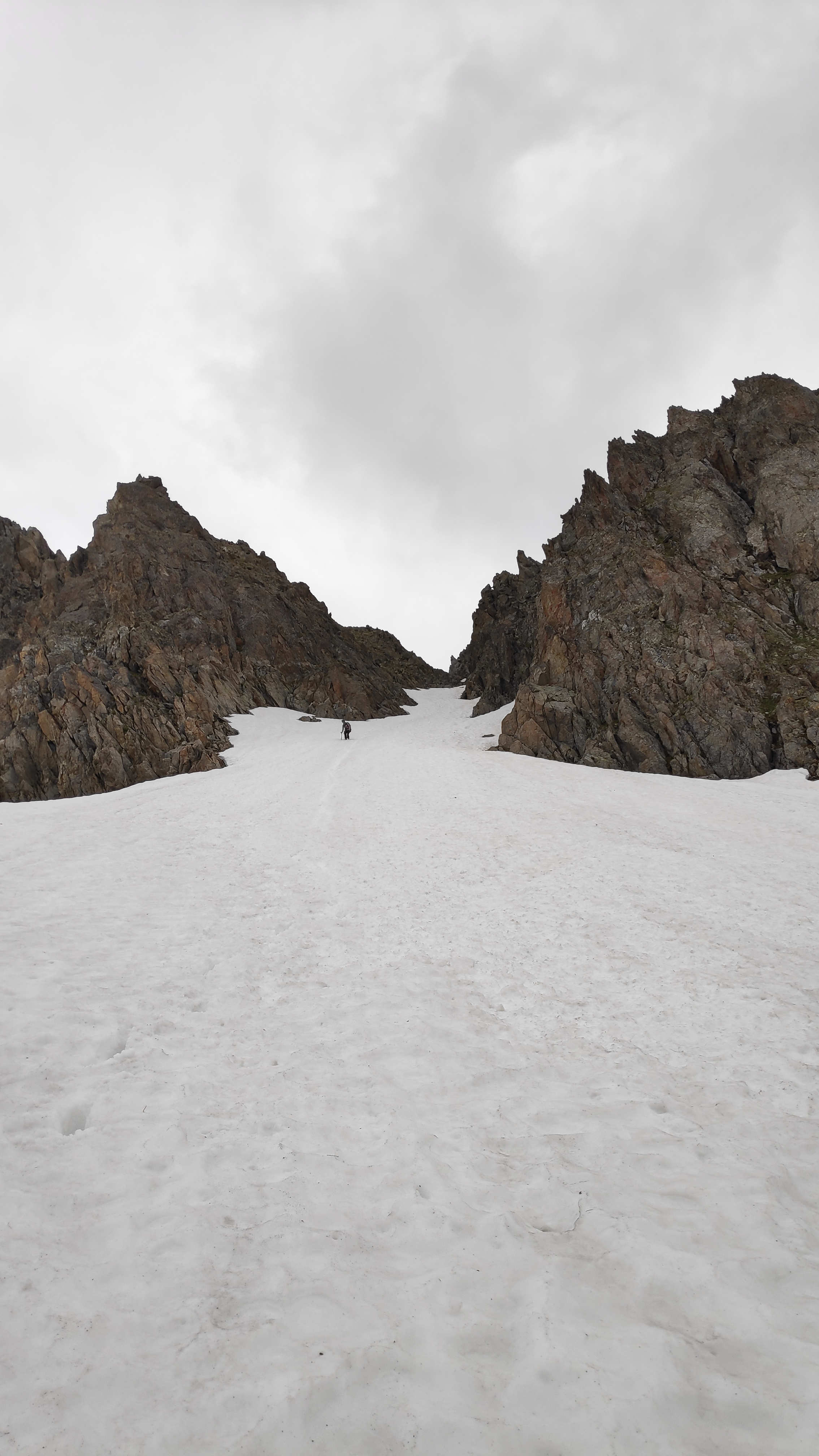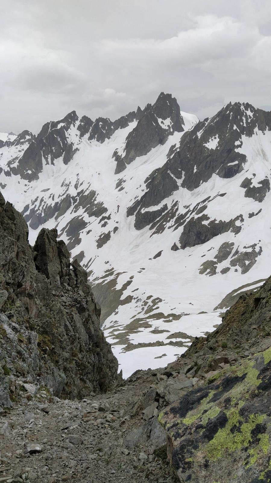 Nun war da noch der Abstieg. Das Couloir welches Caro letztes Jahr gar nicht lustig fand. Da es aber so warm war, waren wir uns sicher, dass der Schnee weich und nicht gefroren sein wird. Um den ersten Schneefreien aber unglaublich schuttigen Teil besser absteigen zu können, sicherte ich Caro von oben her an einem Block. Immer wenn ich nachkam musste sie sich gut am Rand in Deckung bringen, denn ich brachte immer gleich das halbe Couli mit mir. Der Schneeteil ist durchaus Steil, aber immerhin diesmal mit Trittschnee. Also konnten wir die Steigeisen weglassen und uns langsam nach unten tasten. Bald schon waren wir im flacheren Teil und ich nutzte das für eine meiner längsten Rutschfahrten ever, was für ein Spass.