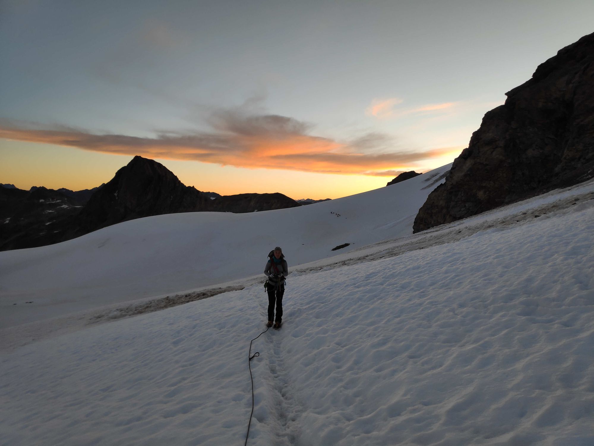 Wir kamen gut voran, noch vor dem Gletschereinstieg, holten wir eine 8ter Gruppe ein. Vor uns lag eine vermeintliche 3er Seilschaft (die gingen ohne Seil, respektive einer hatte das Seil lässig um die Schultern, DAV hald) und eine 2er Seilschaft, die wir noch gut kennenlernen sollten.