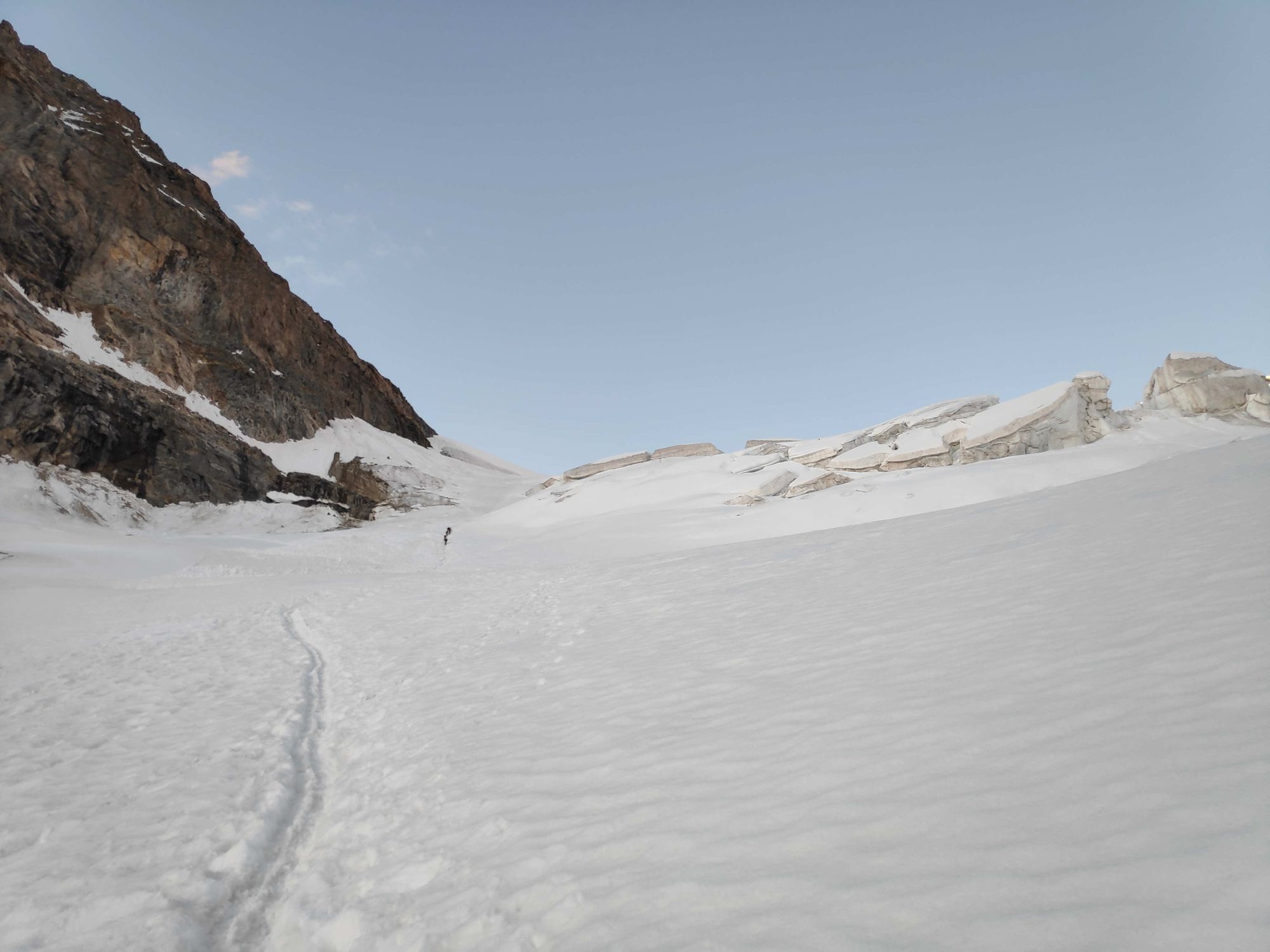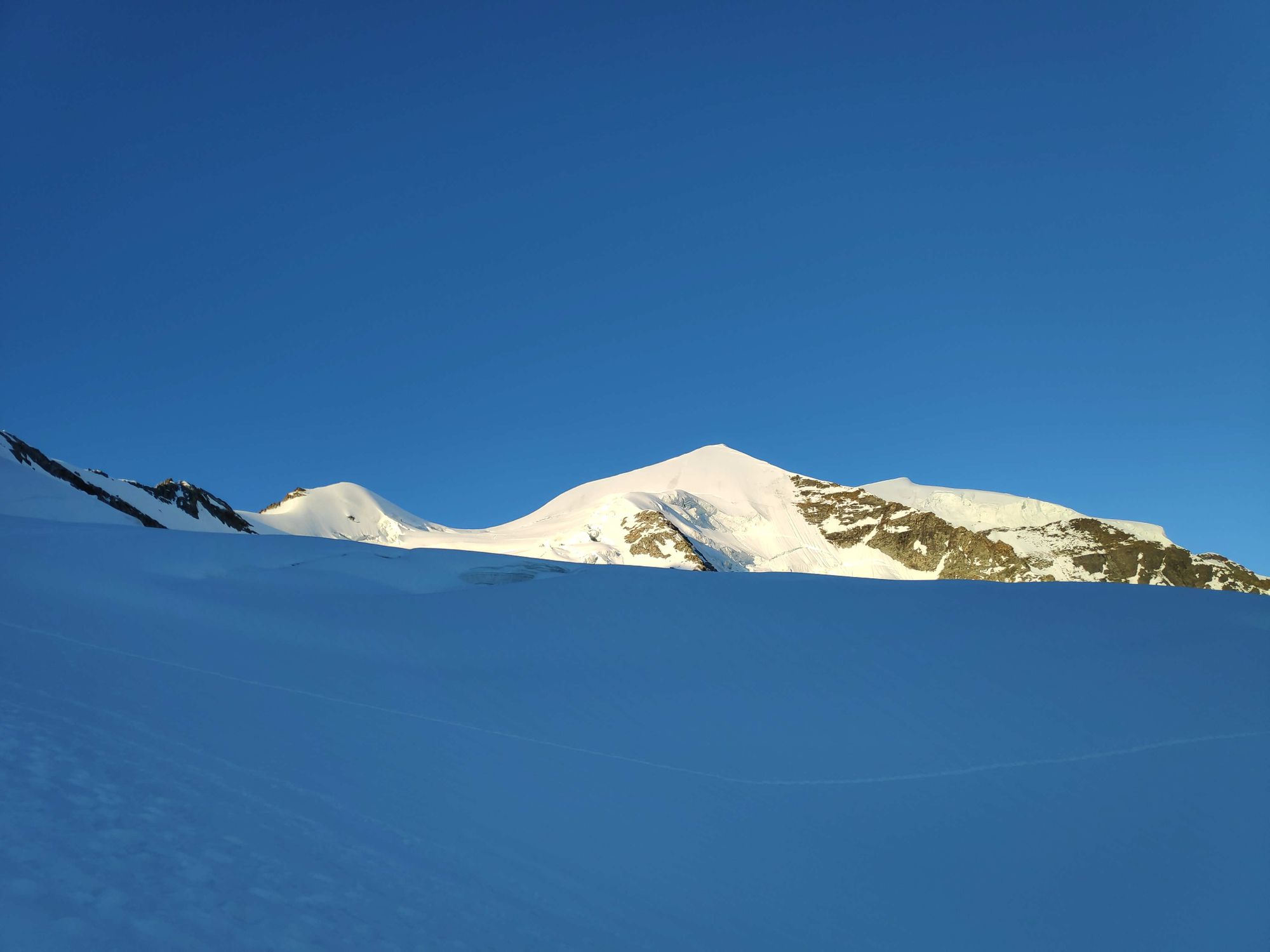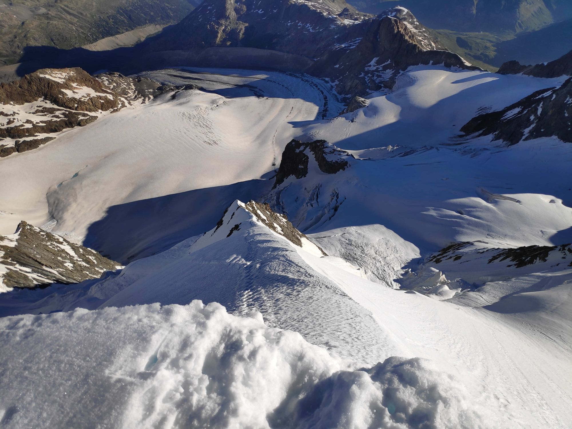 Nun ging es alles zurück, auf dem bereits bekannten Weg. Die Gegenanstiege zum Palü und Ostgipfel, liessen uns nochmals keuchen, danach ging es im Eiltempo runter. Der Schnee begann bereits aufzuweichen und wir wollten uns nicht zu Tode schwitzen.