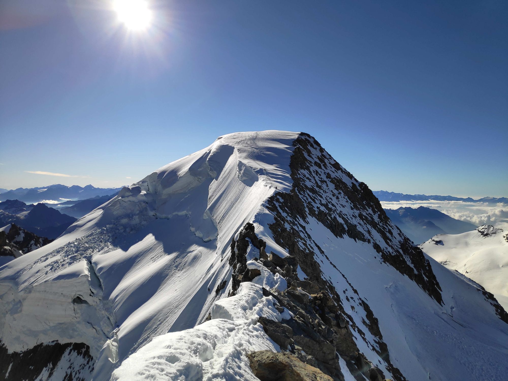 Vom Ostgipfel führt ein schmaler und ausgesetzter Grat rüber auf den Gipfel des Piz Palü. Hier braucht es äusserste Konzentration und Ruhe, einen Ausrutscher verträgt es nicht. Problemlos meisterten wir die Stelle. Nach ziemlich genau 3 Stunden standen wir auf dem Gipfel. Die Führerzeit von 4-6 Stunden kann man getrost vergessen. Wir kamen ins Gespräch mit der 2er Seilschaft und lernten uns von da an gut kennen. Wir trafen sie später im Abstieg, in der Diavolezza und auch in der Bahn. Lustigerweise waren sie am Sonntag ebenfalls auf dem Piz Üertsch, irgendwo hinter uns.