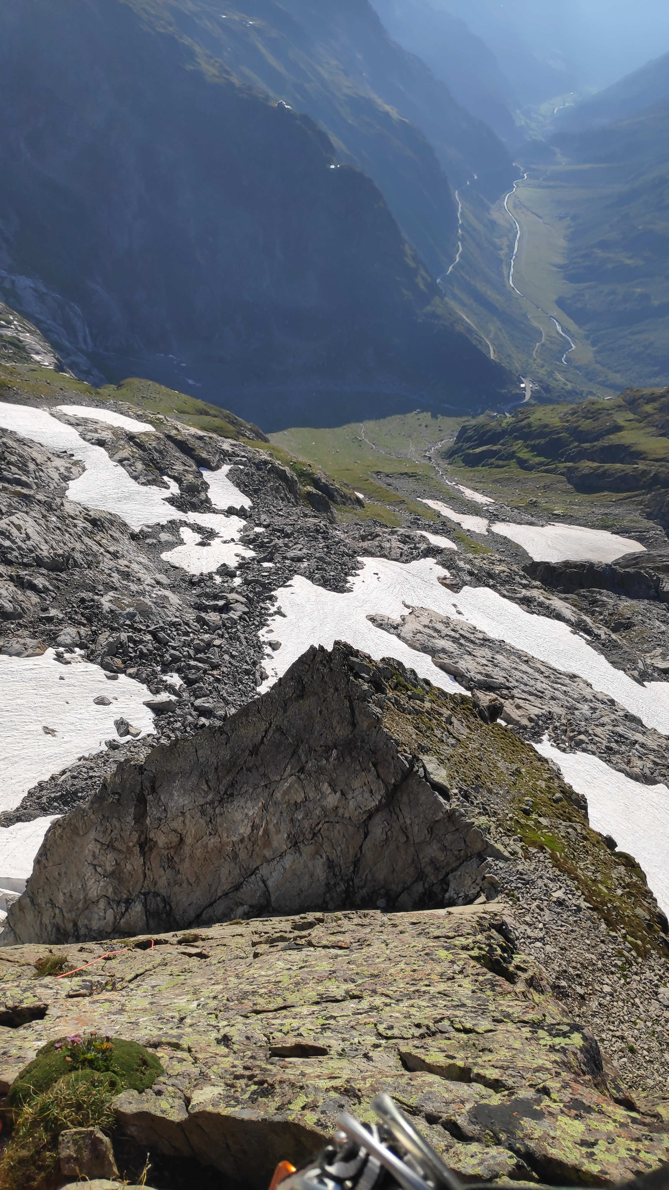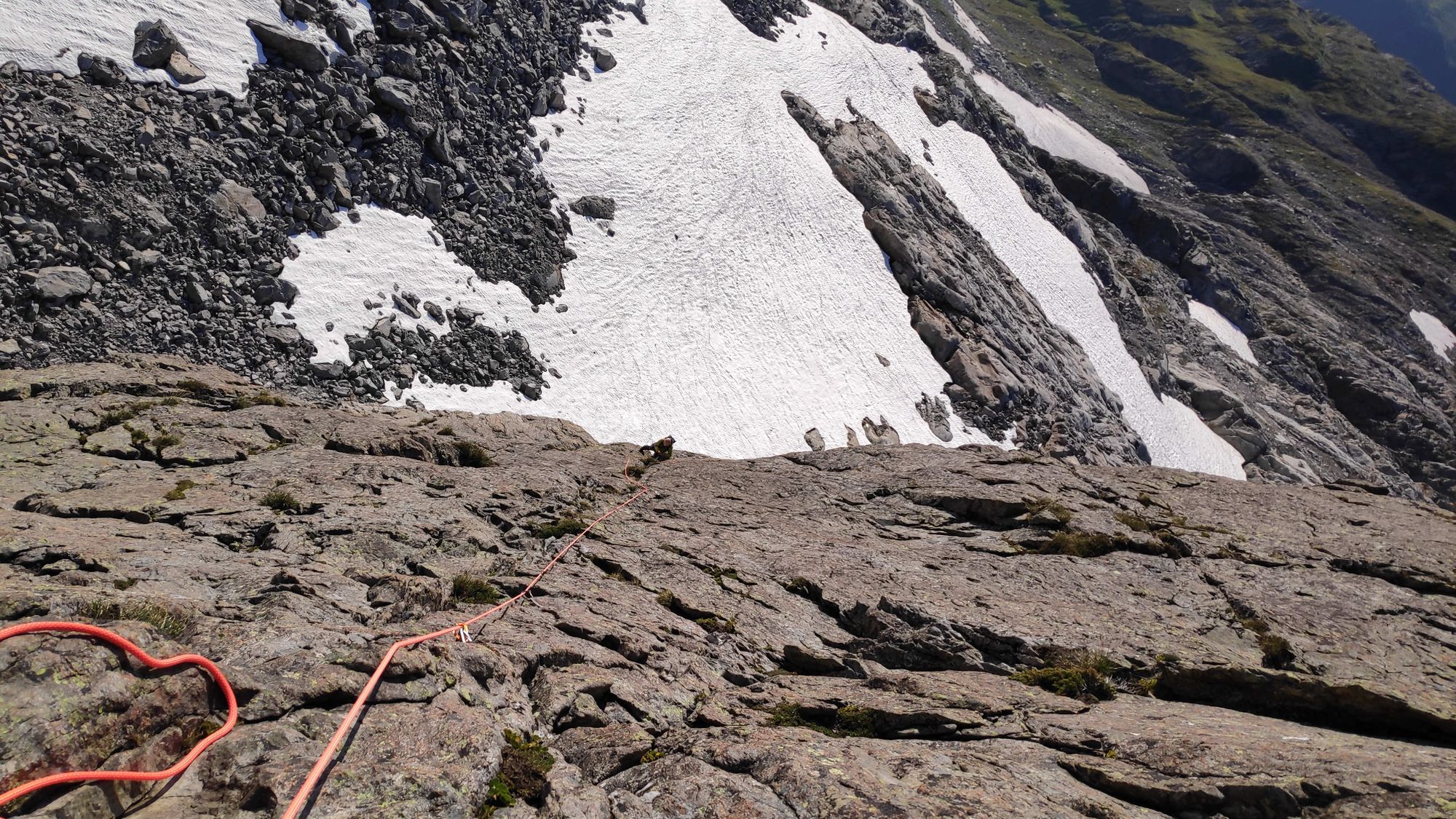 Der Abstieg besteht dann hauptsächlich aus abseilen und vorsichtigem abklettern in sehr brüchigem Gelände. Auch der letzte Abseiler auf den Gletscher war problemlos, dem vielen Schnee sei dank. Wir rutschen den grössten Teil im pfludrigen Schnee runter und legten uns beim Depot unterhalb des Einstiegs in die Sonne, geschafft. Naja nicht ganz, der gurkige Abstieg bis zur Strasse musste auch noch absolviert werden, durch Tonnen von Schaafscheisse.
