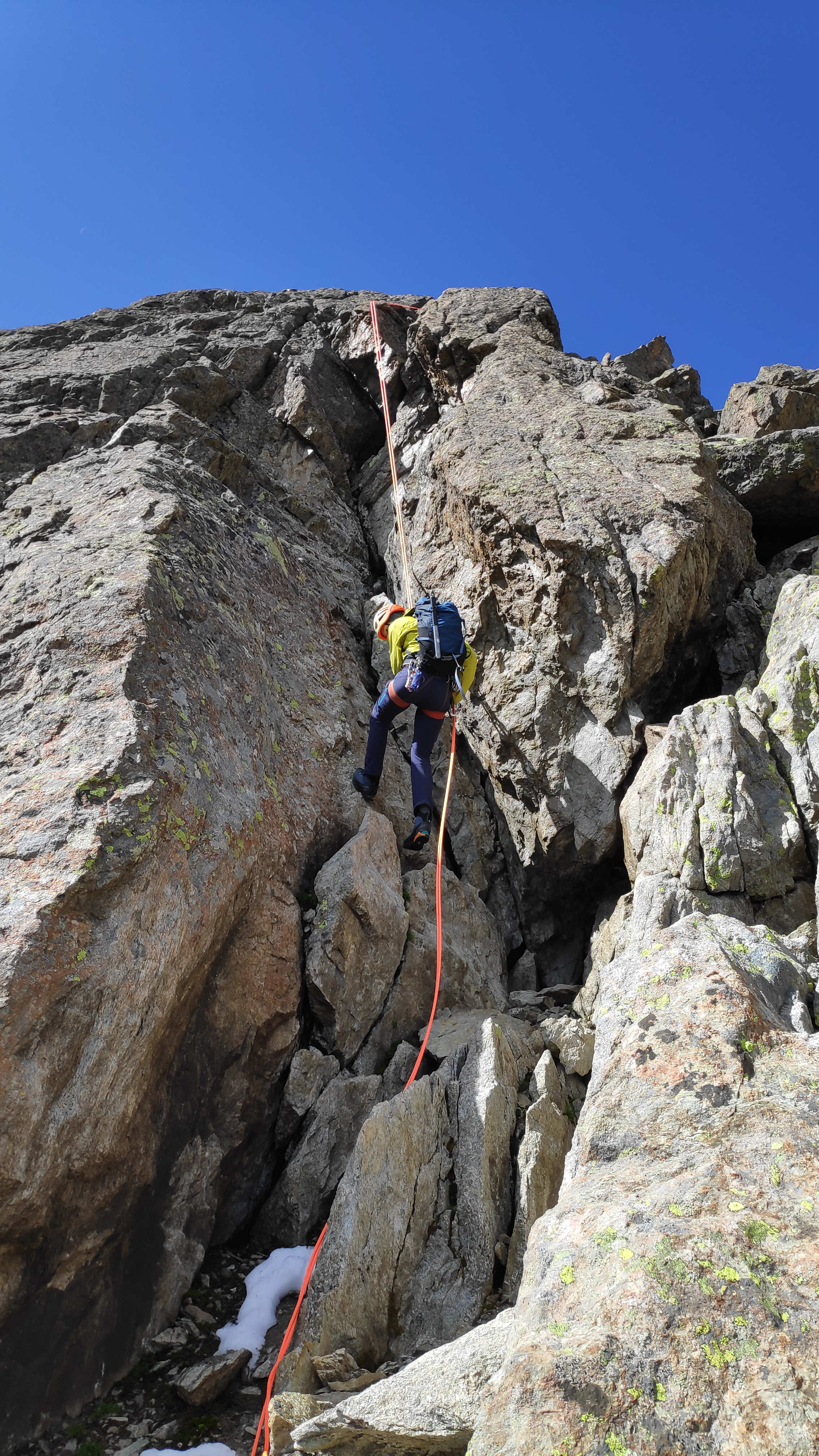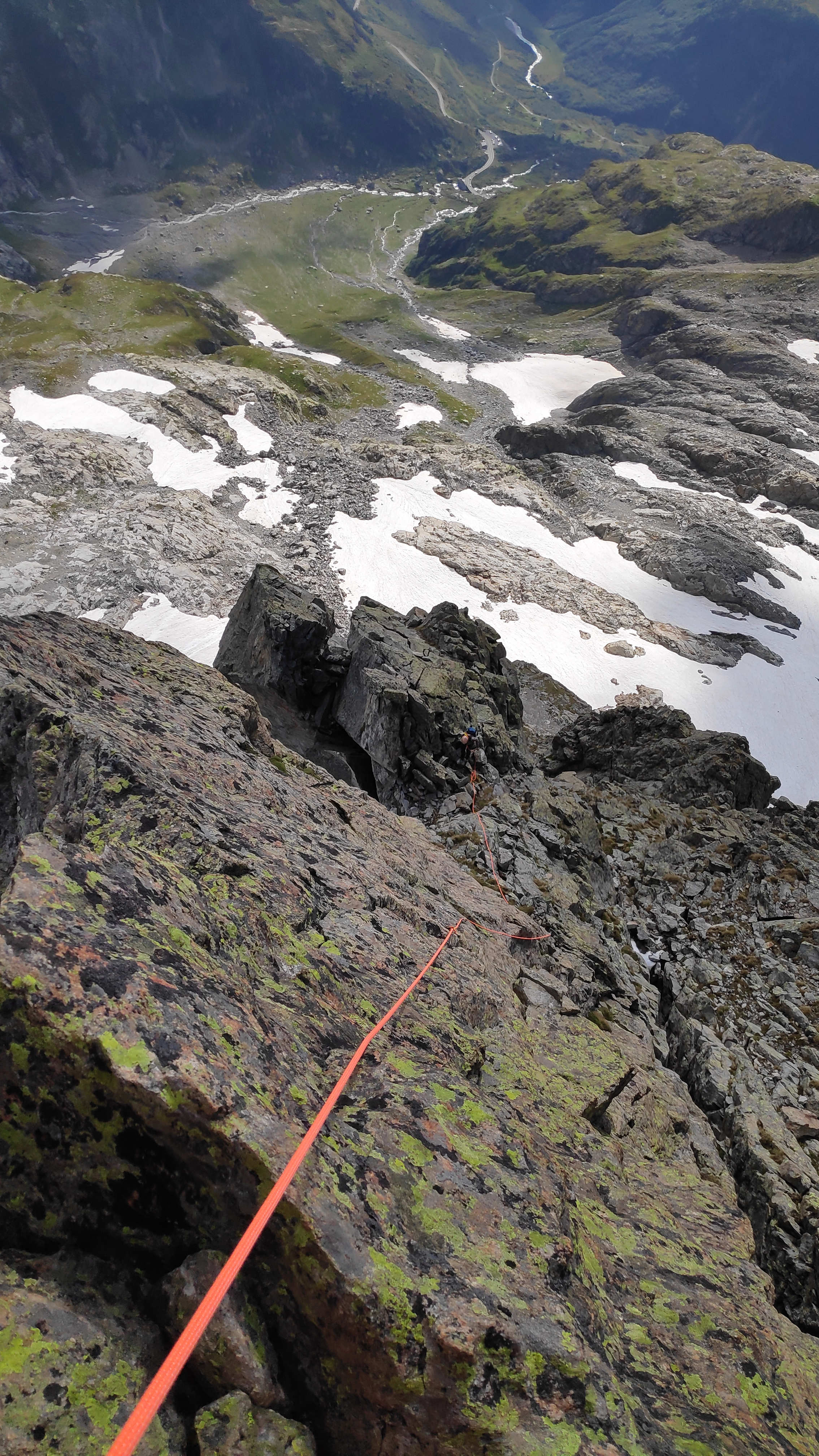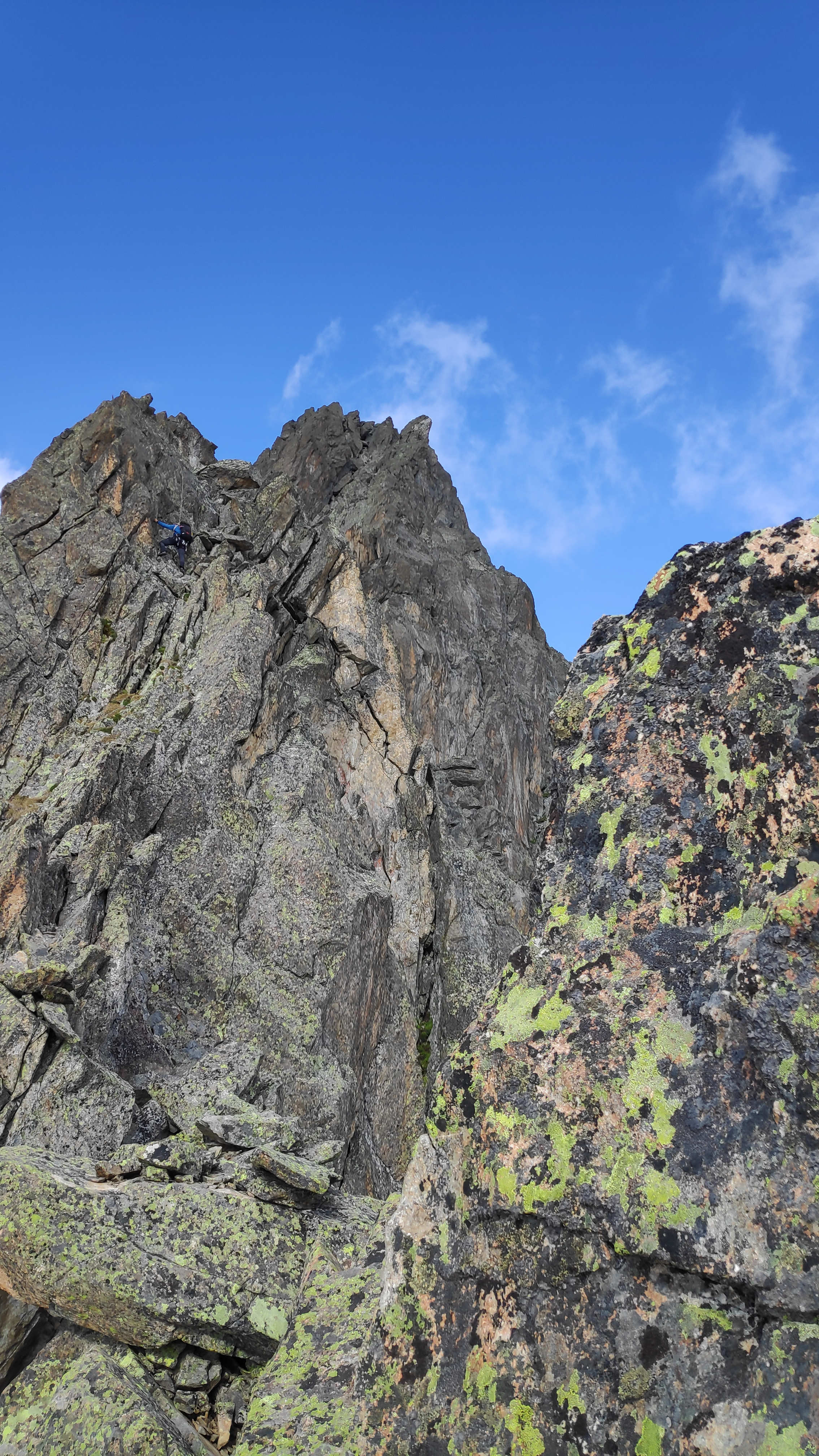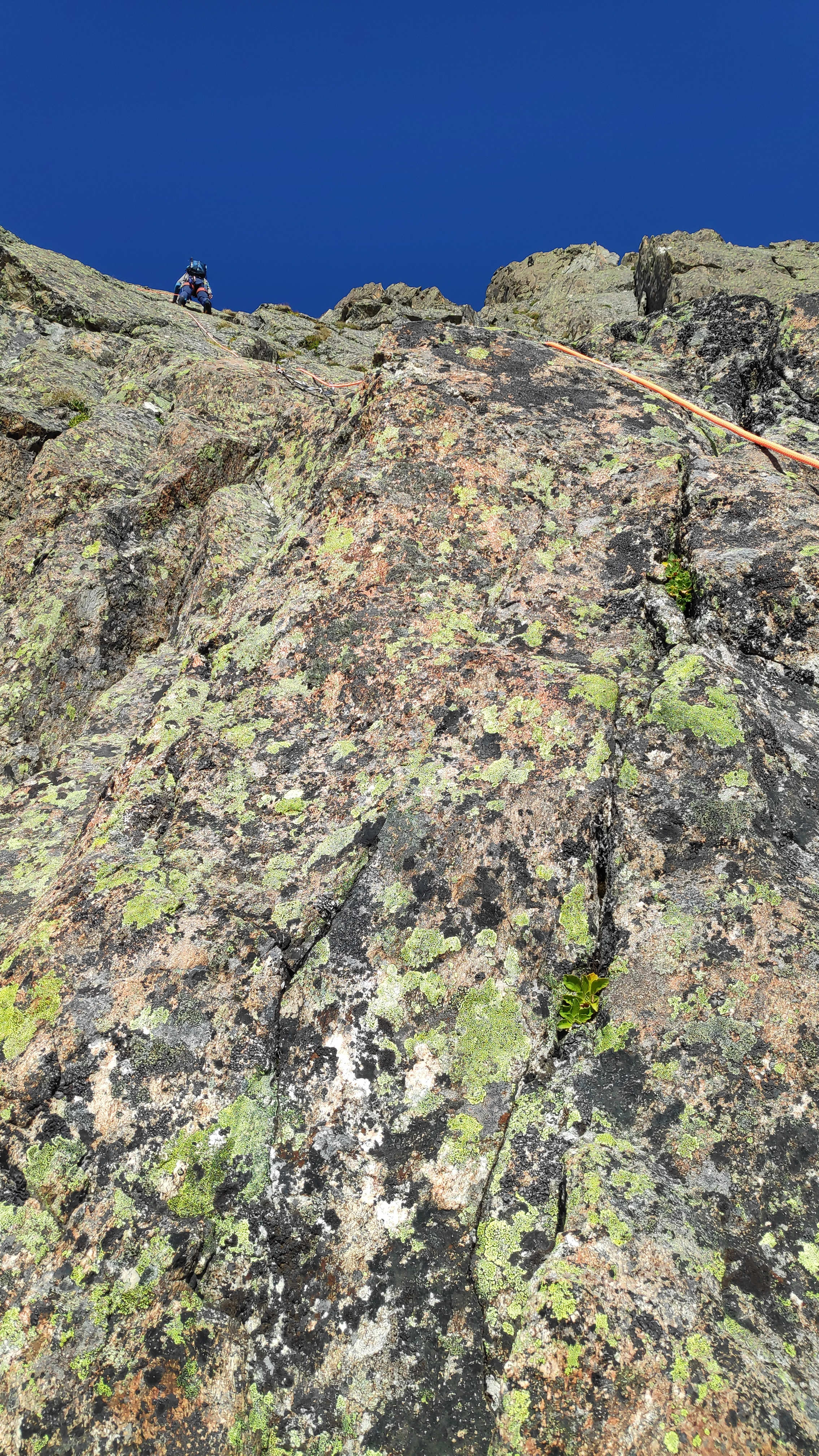 Eine einfache Seillänge führt dann zum ersten Grossen Turm. Diese Seillänge soll die schönste sein, und sie ist wirklich top. Langsam schlossen wir zur Seilschaft vor uns auf. Ein Bergführer mit Gast. Ein weiterer Turm, ebenfalls toll zu klettern und schon bald hinter uns. Wir entledigten uns der Finken, vor allem meine Füsse schmerzten nun langsam und wechselten auf die Bergschuhe. Die folgenden knapp 4 Seillängen bis zum Gipfel sollten nicht mehr allzu schwer sein, maximal im dritten Grad. Wir machten gleich Rast und schauten der anderen Seilschaft zu, wie sie durch das brüchige Couloir hochstiegen.