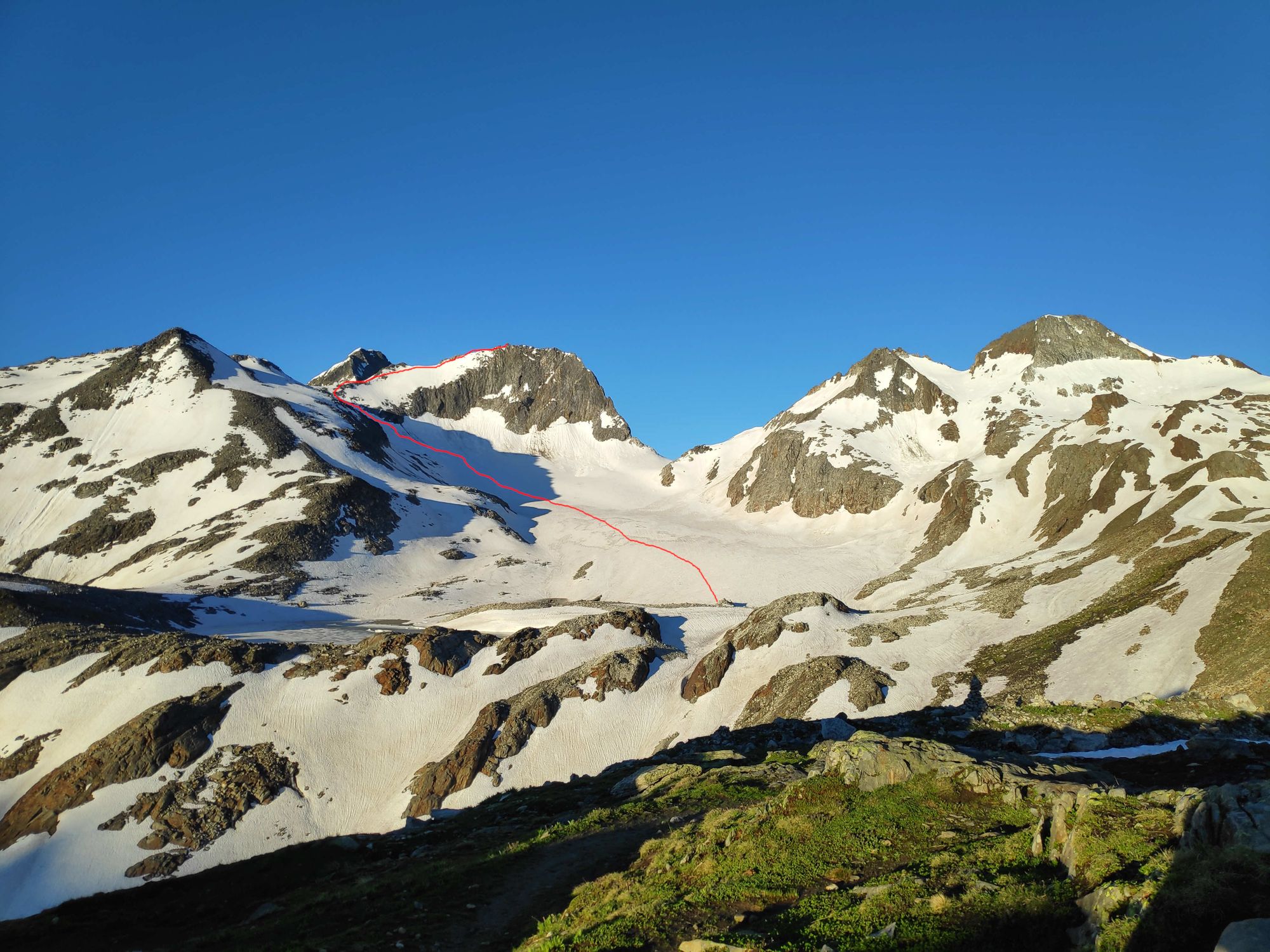 Erst hoffte und dachte ich, die Gruppe wird auf die Leckihörner gehen. Falsch, sie zielten alle zwölf auf den Witenwasserenstock. Mit etwa 25 Minuten Rückstand kamen wir am Gletscher an. Ich war überzeugt wir können die noch einholen, Caro war von der Idee und den Erfolgsaussichten nicht sehr begeistert. Ich schlug ein hohes Tempo an, aber drückte nicht voll aufs Gas. Im steilen Schlussteil unterhalb der Lücke, schlossen wir fast zu der zweier Seilschaft auf und wie wir oben in der Lücke ankamen, sahen wir die 10ner Gruppe am rumsitzen. Hahaaa geschafft, also zogen wir gleich nach rechts weiter und übernahmen die Führung. Die 10ner Gruppe war sichtlich überrascht. Die zweier Seilschaft wussten sie hinter sich, aber das wir uns bereits so Nahe angeschlichen haben, wussten sie offenbar nicht. Sogleich schlossen sie sich, in 3 Seilschaften uns an. Da der Schnee sehr weich und tief war, wich ich auf die Felsen aus. Die anderen Seilschaften folgten unserem Entscheid, wichen aber früher wieder auf den Schnee aus und folgten den alten Spuren. Uns wars egal, wir knirschten mit Steigeisen an den Füssen der Gratkante entlang und querten viel später erst zurück in die Firnflanke.