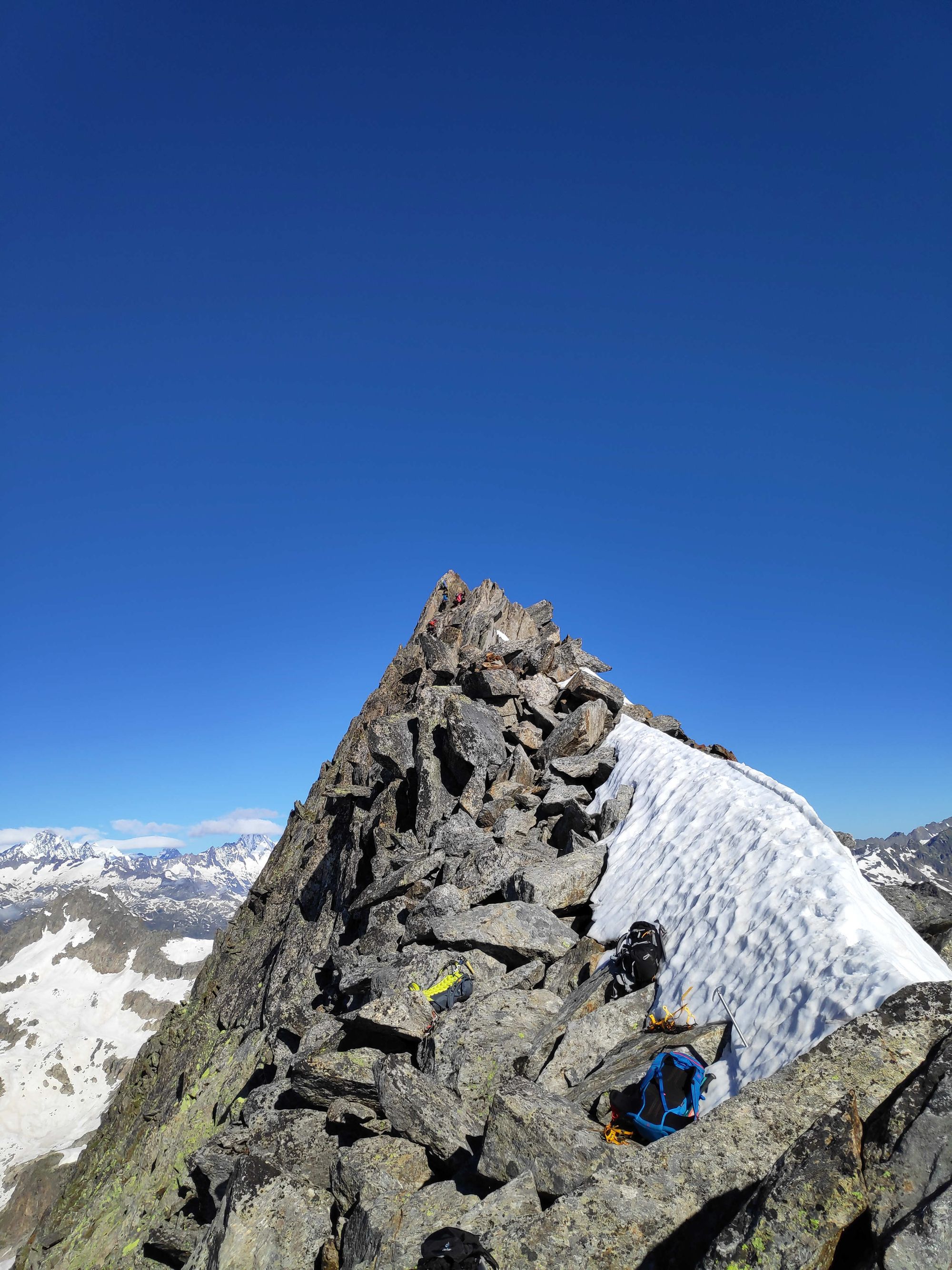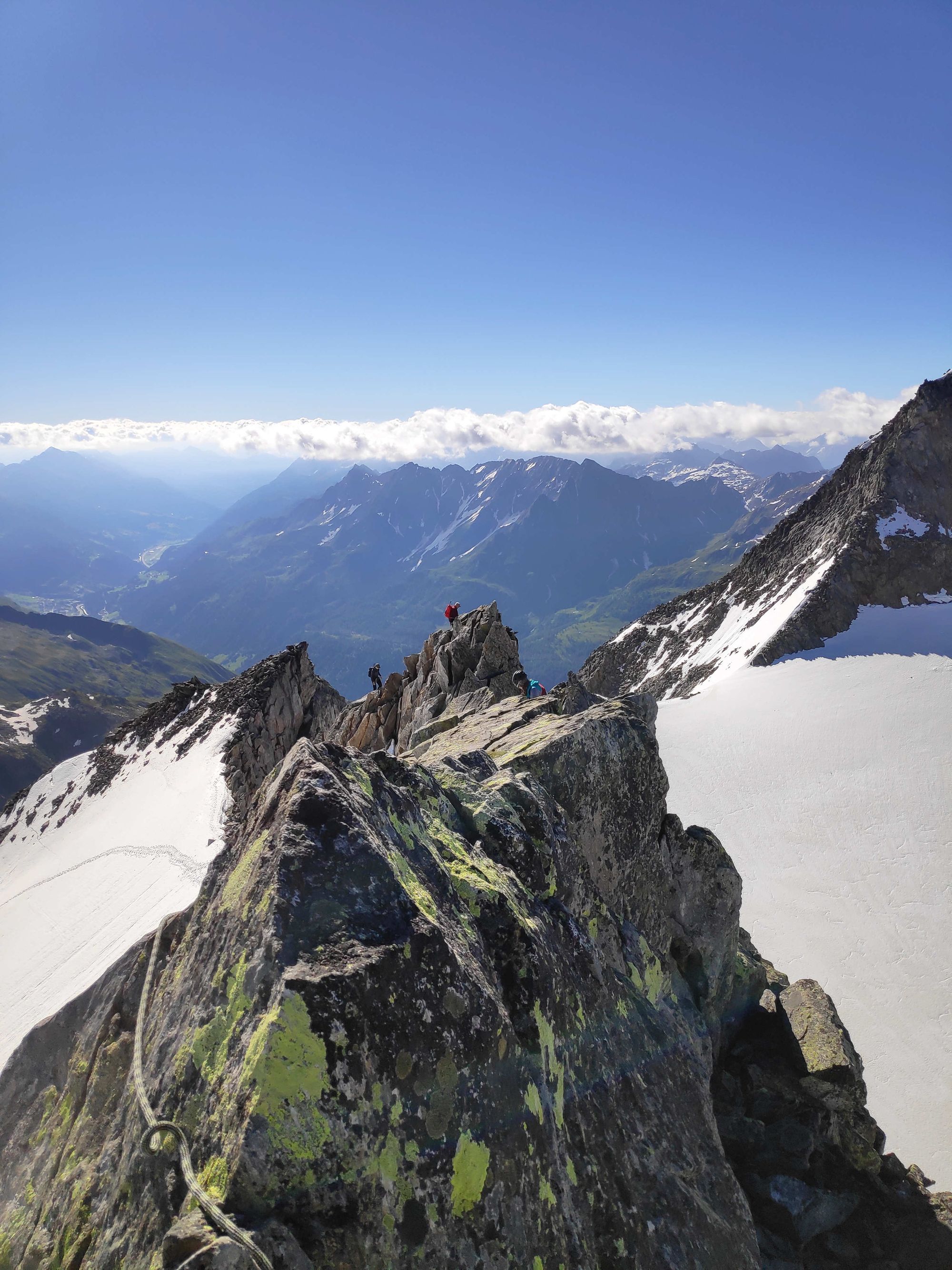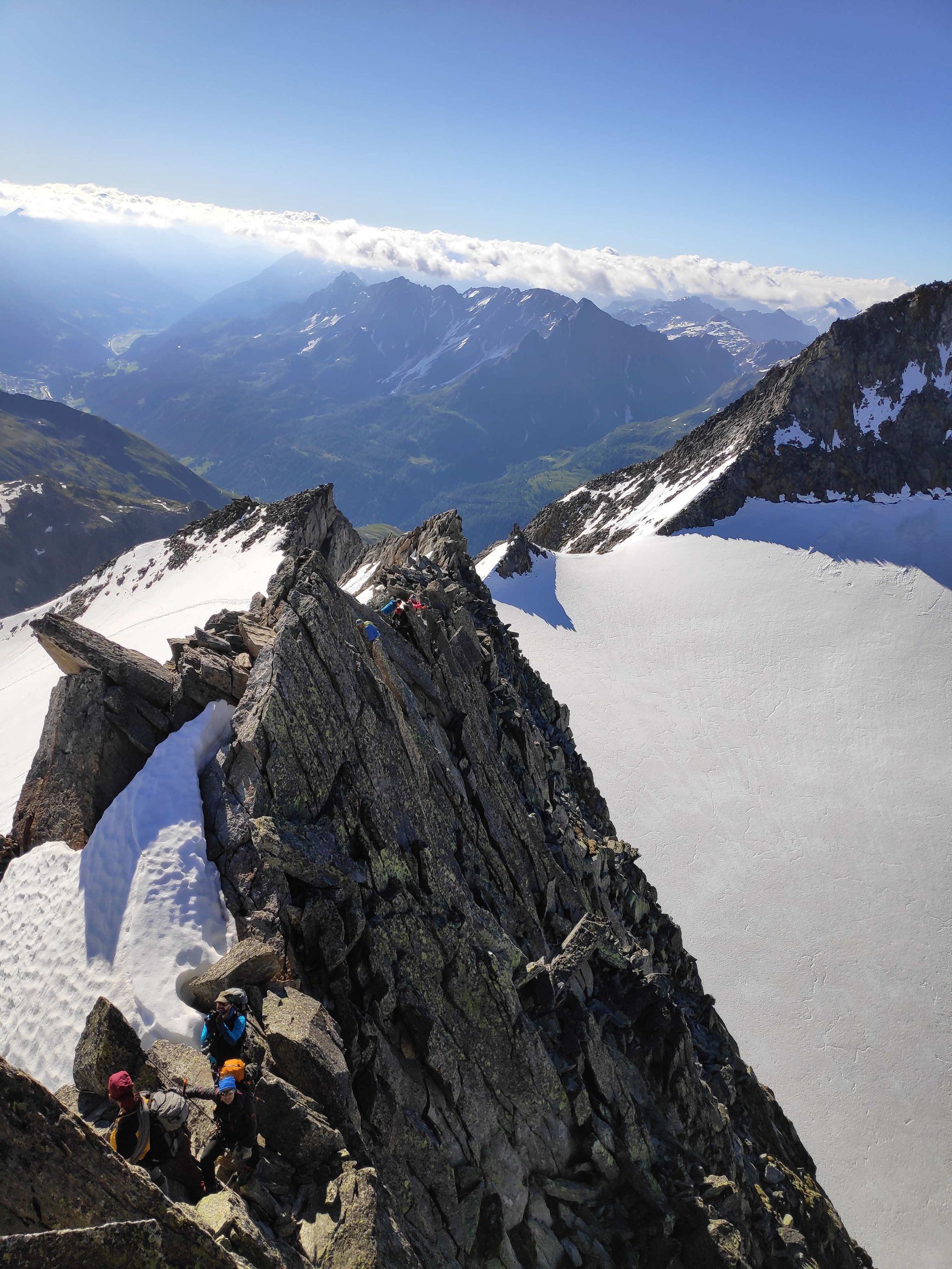 Beim ersten steilen Aufschwung, einer 3a Kletterstelle, kletterten wir, weiter mit Steigeisen, auf den Platten nach oben bis zu einem Stand. Oben angekommen konnten wir den Rest des Blockgrates erkennen und entschlossen uns die Steigeisen und Rucksäcke hier zu deponieren. Währenddessen unterquerte uns die vorderste 3er Seilschaft. Offensichtlich dachte der Bergführer der Gruppe, es wäre einfacher im immer steiler werdenden Firn hochzusteigen. Wir hörten wir er mit der Seilschaft hinter sich kommunizierte und fragte ob sie nicht doch auch besser auf den Fels ausweichen hätten sollen.